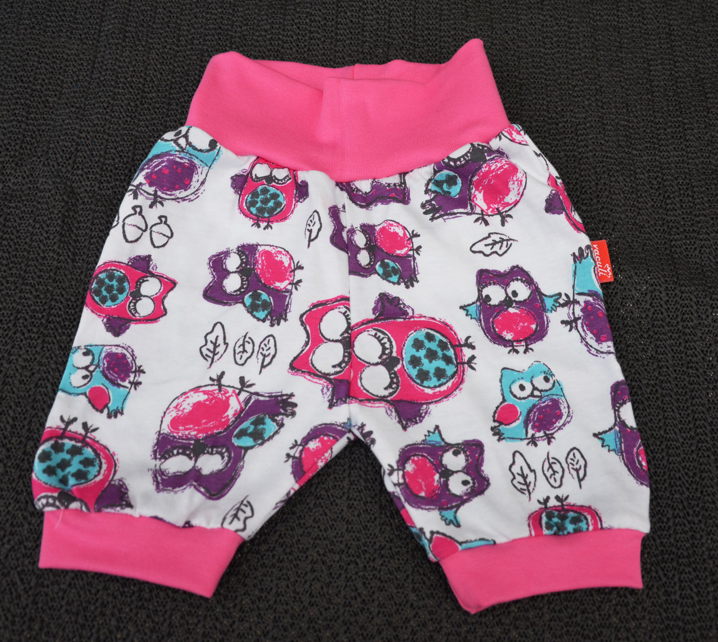 Pohodlné kojenecké kraťásky s barevnými sovičkami na bílém podkladu v kombinaci s malinovým lemem.Dvojitý lem kolem pasu, který je pro malé děti většinou dostačující. Pro všechny případy je v samotném lemu předpřipravený otvůrek na gumu.