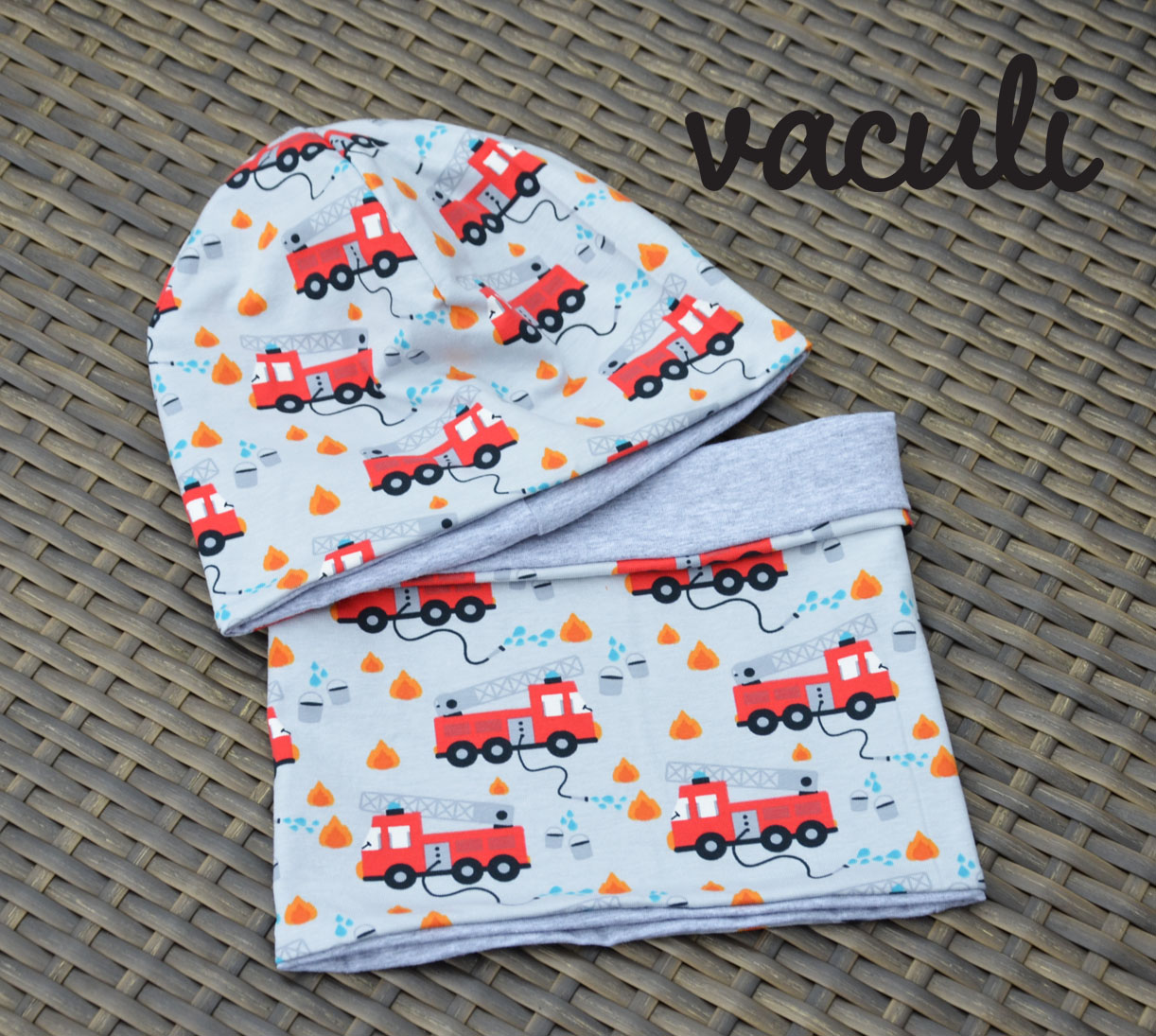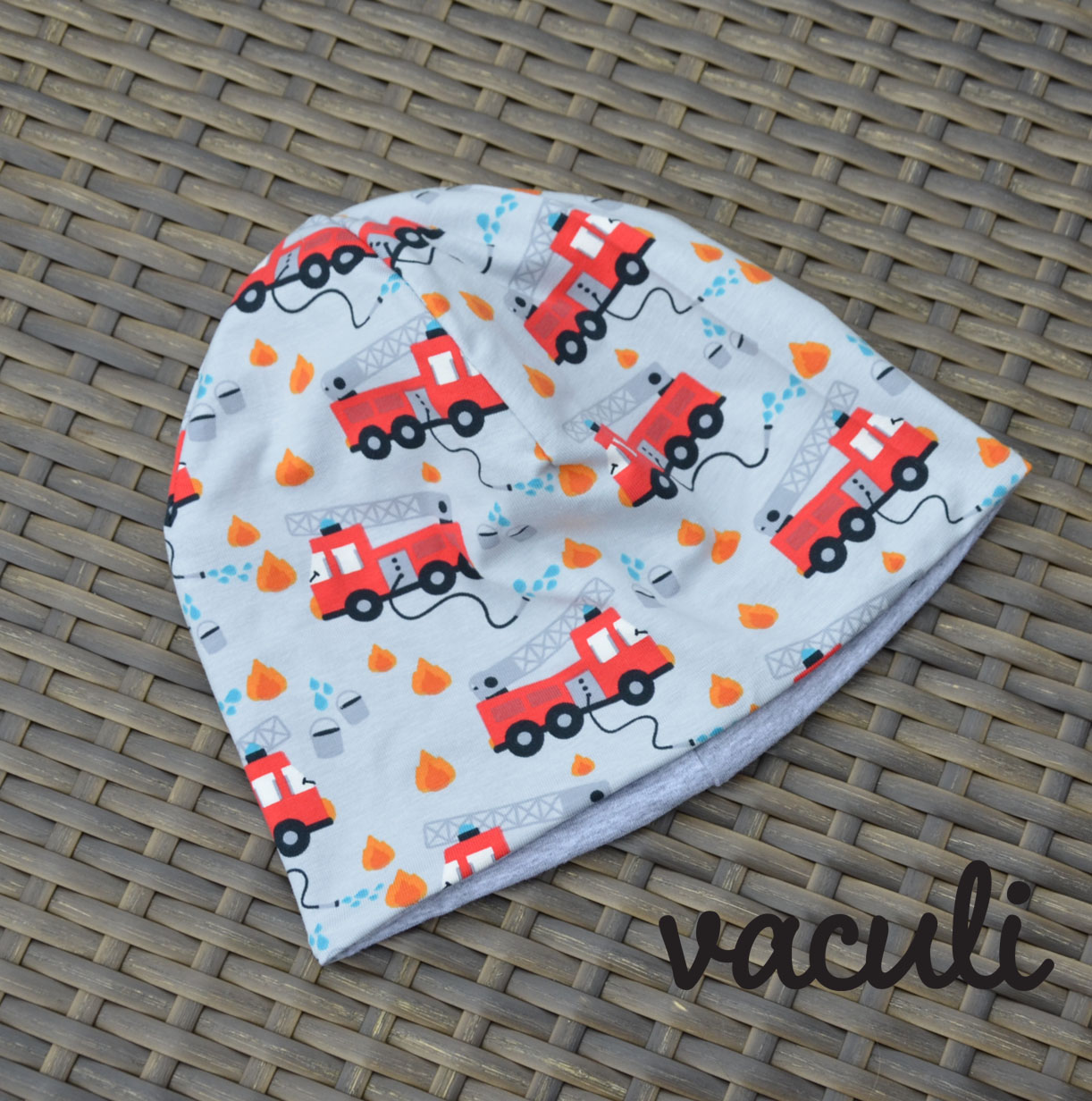 Čepička rovného střihu Doble v dezénu Hasiči na šedé v kombinaci s jednobarevným úpletem (žíhaná sv. šedá).