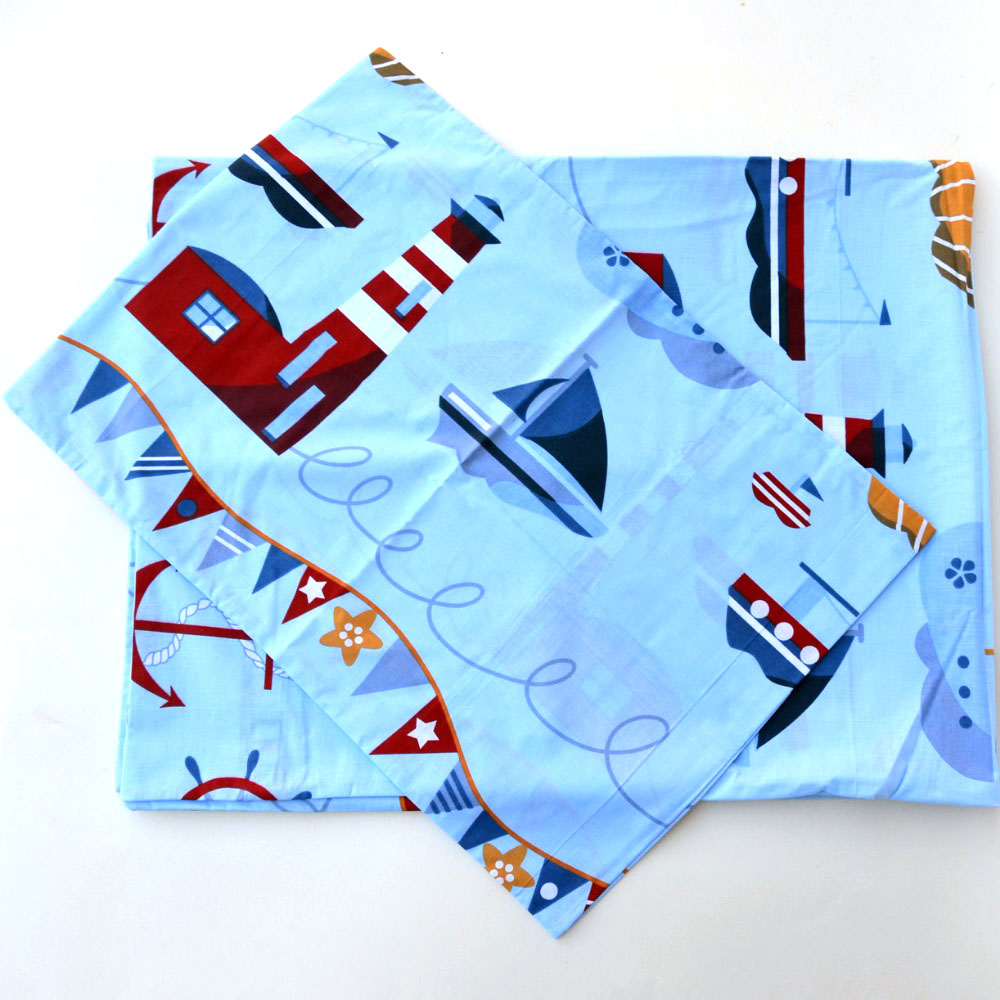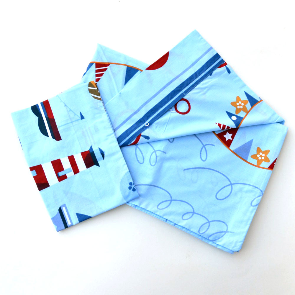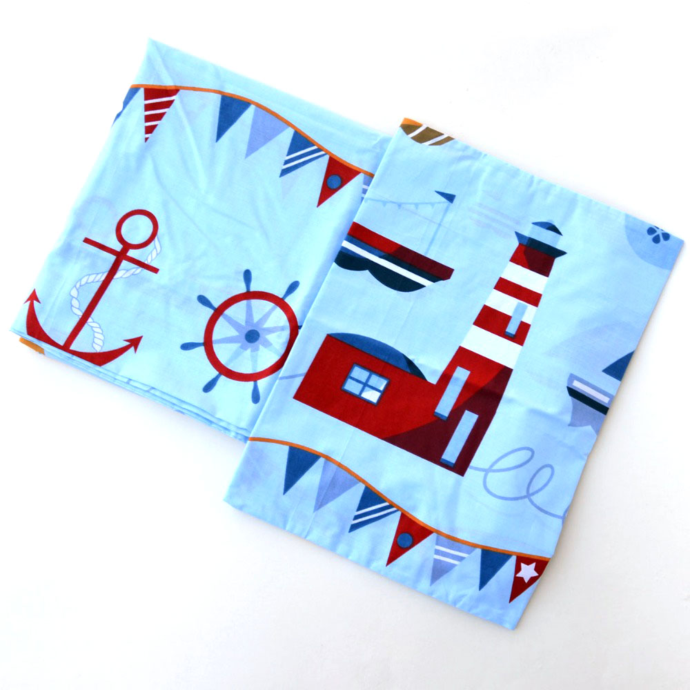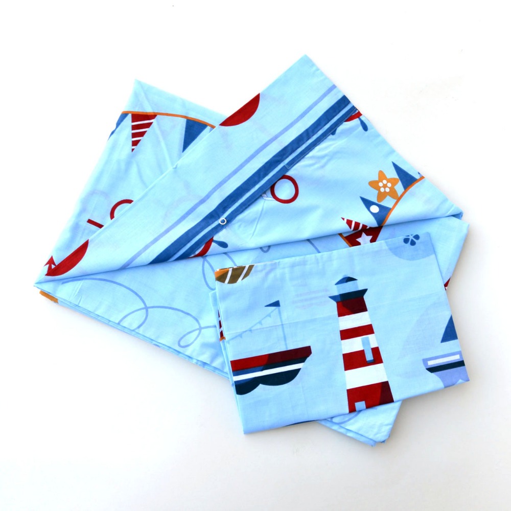 Majáky, lodě, praporky na sv. modrém podkladu, vhodné pro chlapečka.