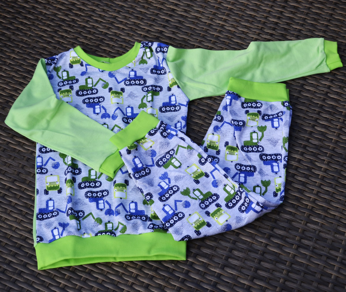 Pyžamo z bavlněného úpletu gramáže 140 g/m2. Spodní díl v potisku bagříci, vrchní díl má v potisku přední stranu, rukávy a zadní díl zelené, zelené lemy.