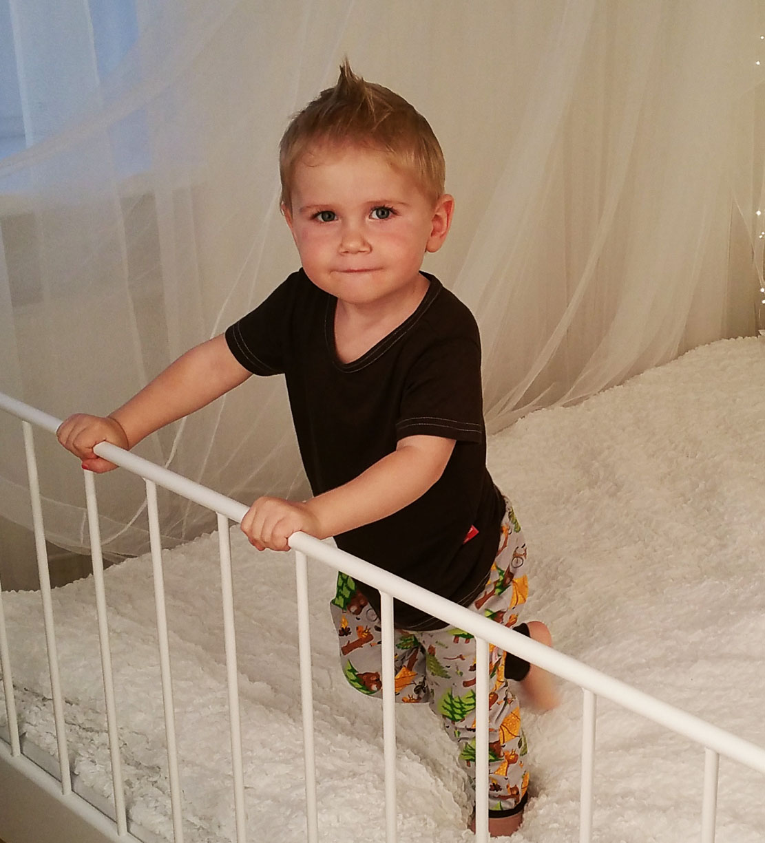 Dvojitý lem kolem pasu je pro menší děti většinou dostačující. Pro všechny případy je v samotném lemu připravený otvůrek na gumu, kdyby dítěti tepláčky padaly. Od vel. 98 nižší lem s již navlečenou gumou, kterou si můžete dle libosti regulovat.
