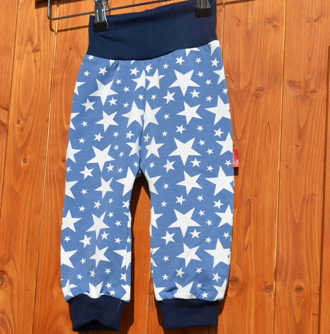 Elastické tepláčky ve dezénu Bílé hvězdy na modré, temně modré lemy u kontíků a v pase.