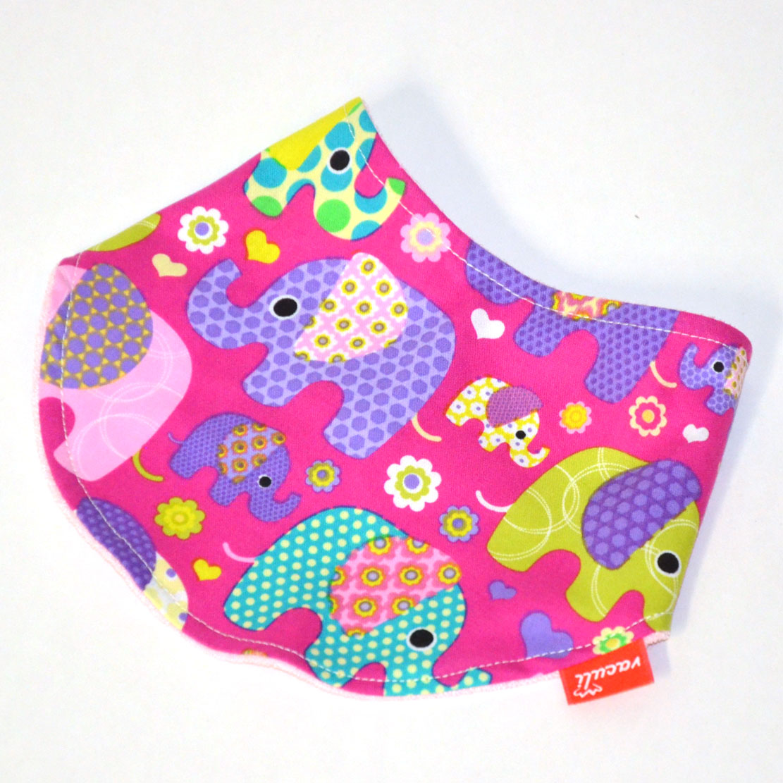 Veselý dětský šáteček/slintáček s motivem barevných sloníků na fialovém pozadí. Ten pravý pomocník při slintání nebo zateplení krku v období jaro/podzim. Dvojitá vrstva pro lepší savost. Přední strana 100% bavlna, zadní strana růžové froté. Zapínání na 2 baby druky = 3 možnosti obvodu. Univerzální velikost, vhodná od miminek pro předškoláky.