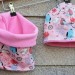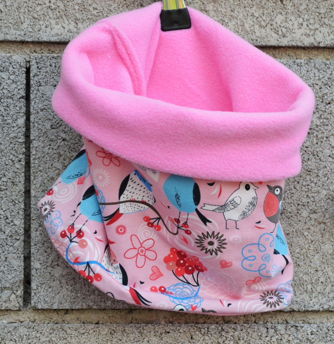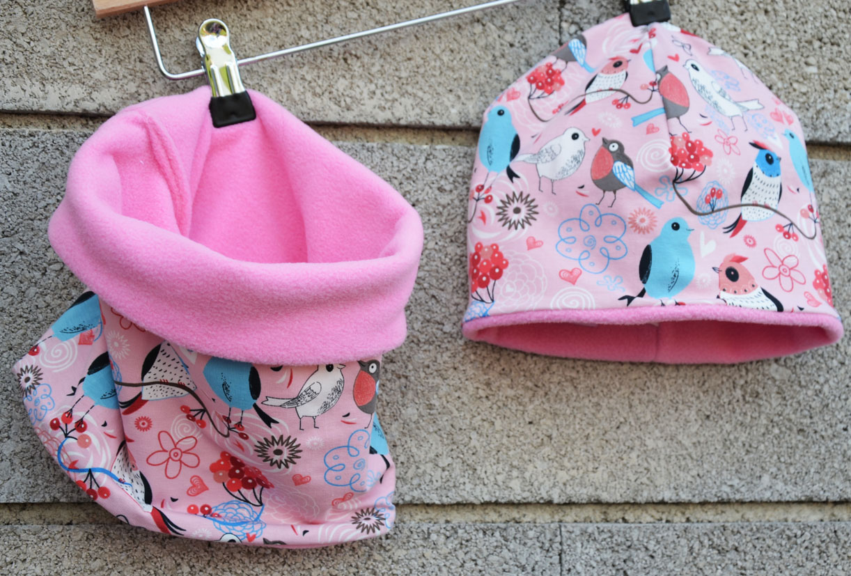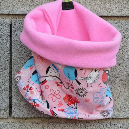 Dezén: Ptáčci na růžové(úplet 95% bavlna, 5 % elastan) v kombinaci s růžovým fleecem