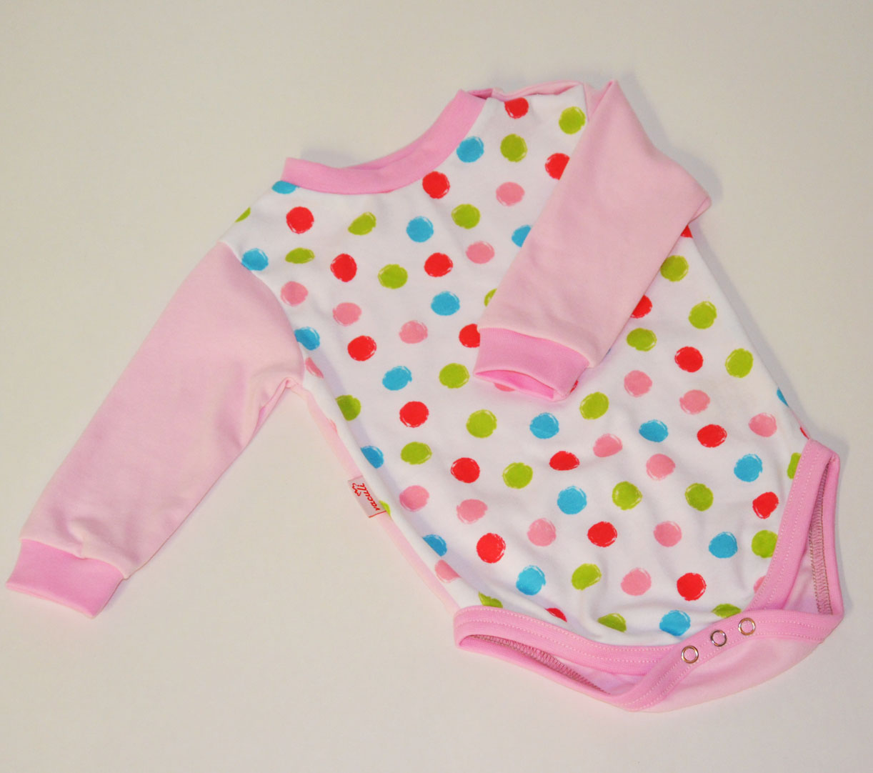 Pohodlné bavlněné body - úpletová bavlna, na předním díle potisk barevních puntíků na bílém podkladu, zadní díl a rukávyze sv. růžového úpletu, stejně tak i lemy. DOSTUPNÉ V MNOHA VELIKOSTECH! viz varianty zboží.