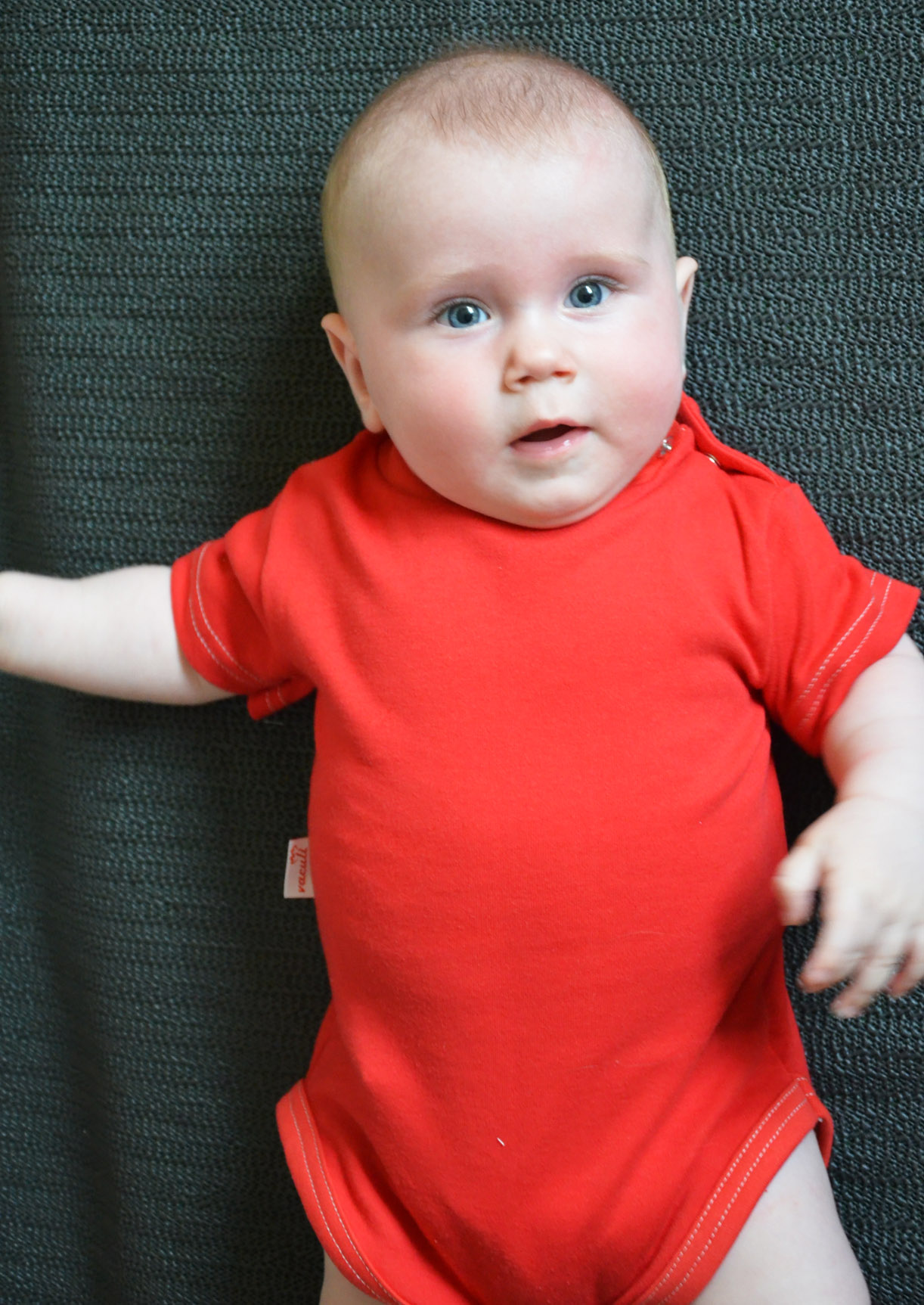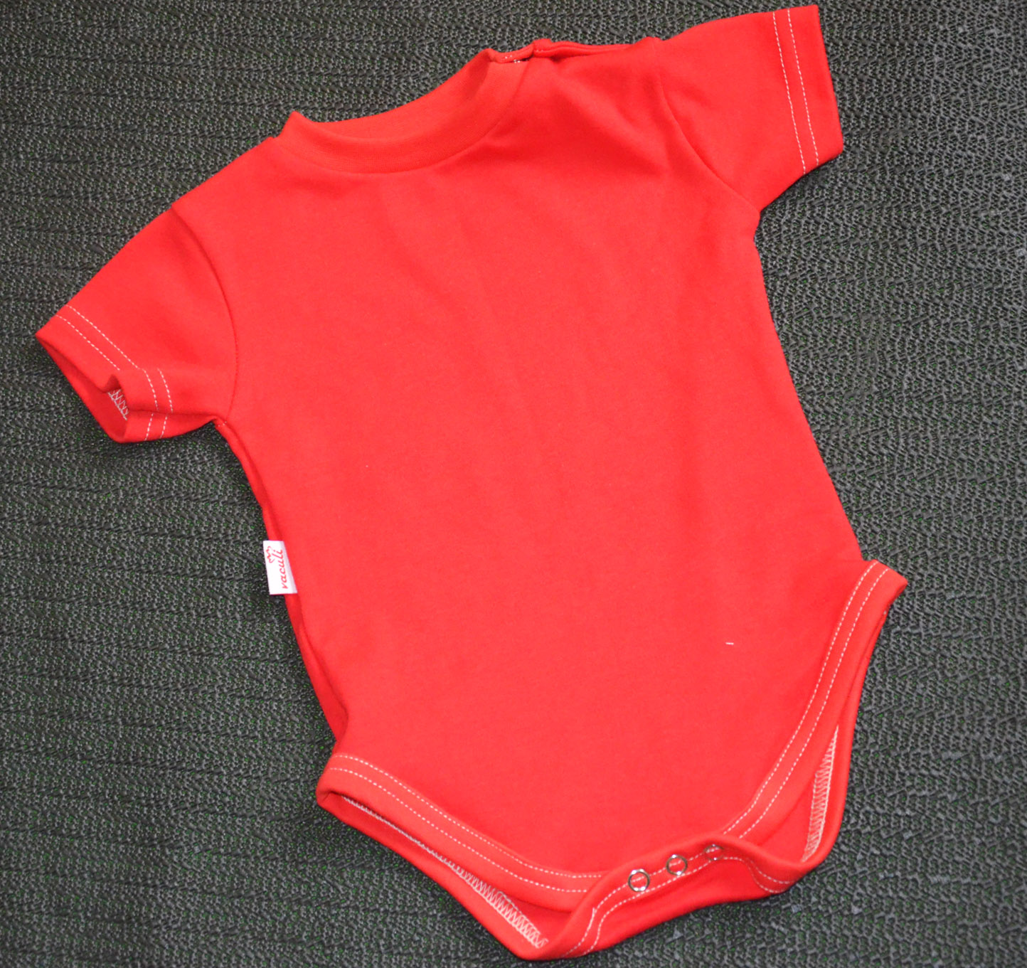 Pohodlné kojenecké body jednobarevné, červené, červené lemy. Lemy kolem zápěstí pěkně drží rukávy a body roste s dítětem. U krku zapínání na baby druky, žádný vytahaný výstřih. Mezi nožkama rovněž zapínání na baby druky.