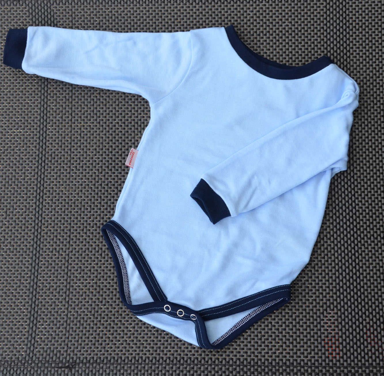 Pohodlné kojenecké body jednobarevné, sv. modrý úplet, temně modrélemy. Lemy kolem zápěstí pěkně drží rukávy a body roste s dítětem. U krku zapínání na baby druky, žádný vytahaný výstřih. Mezi nožkama rovněž zapínání na baby druky.