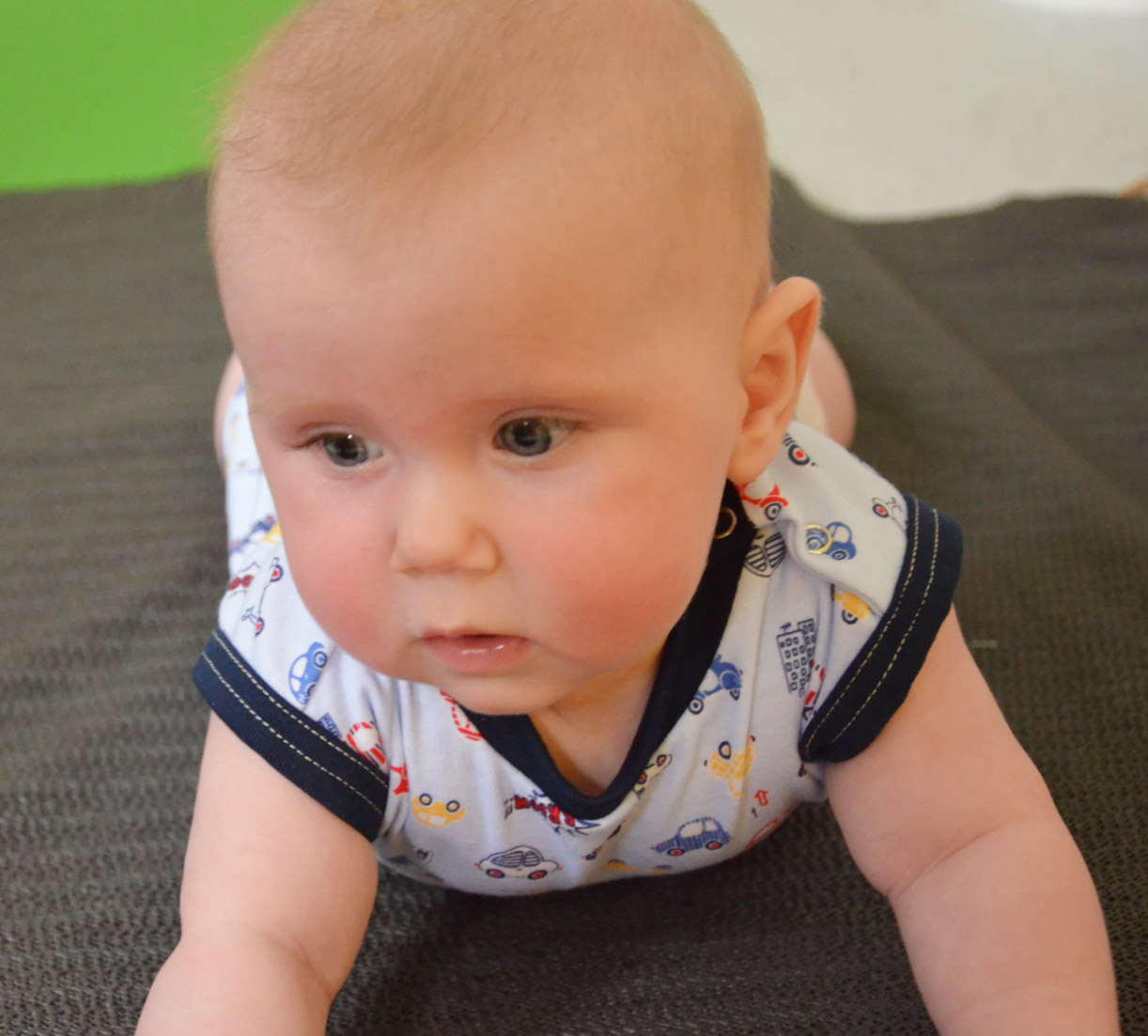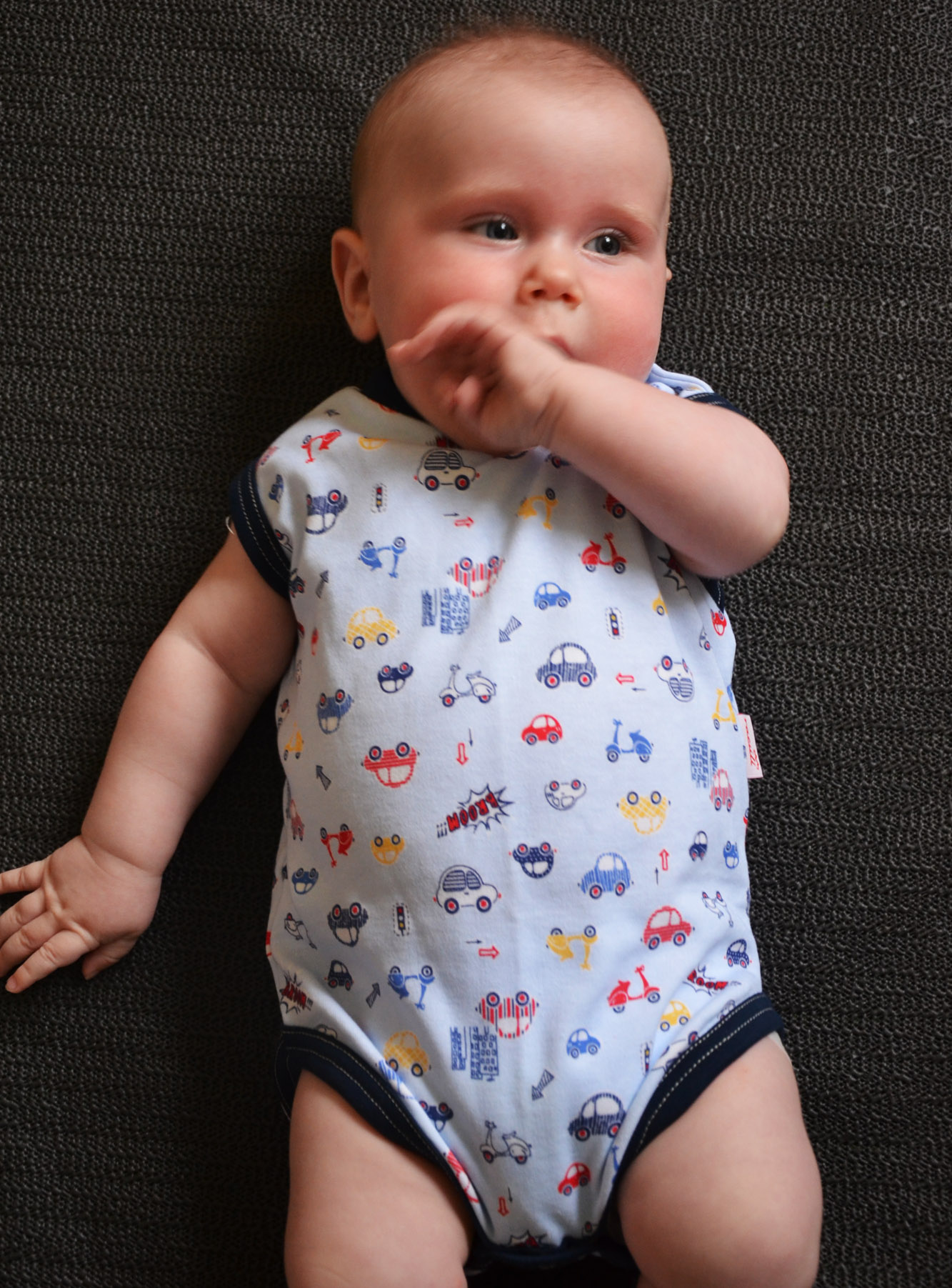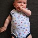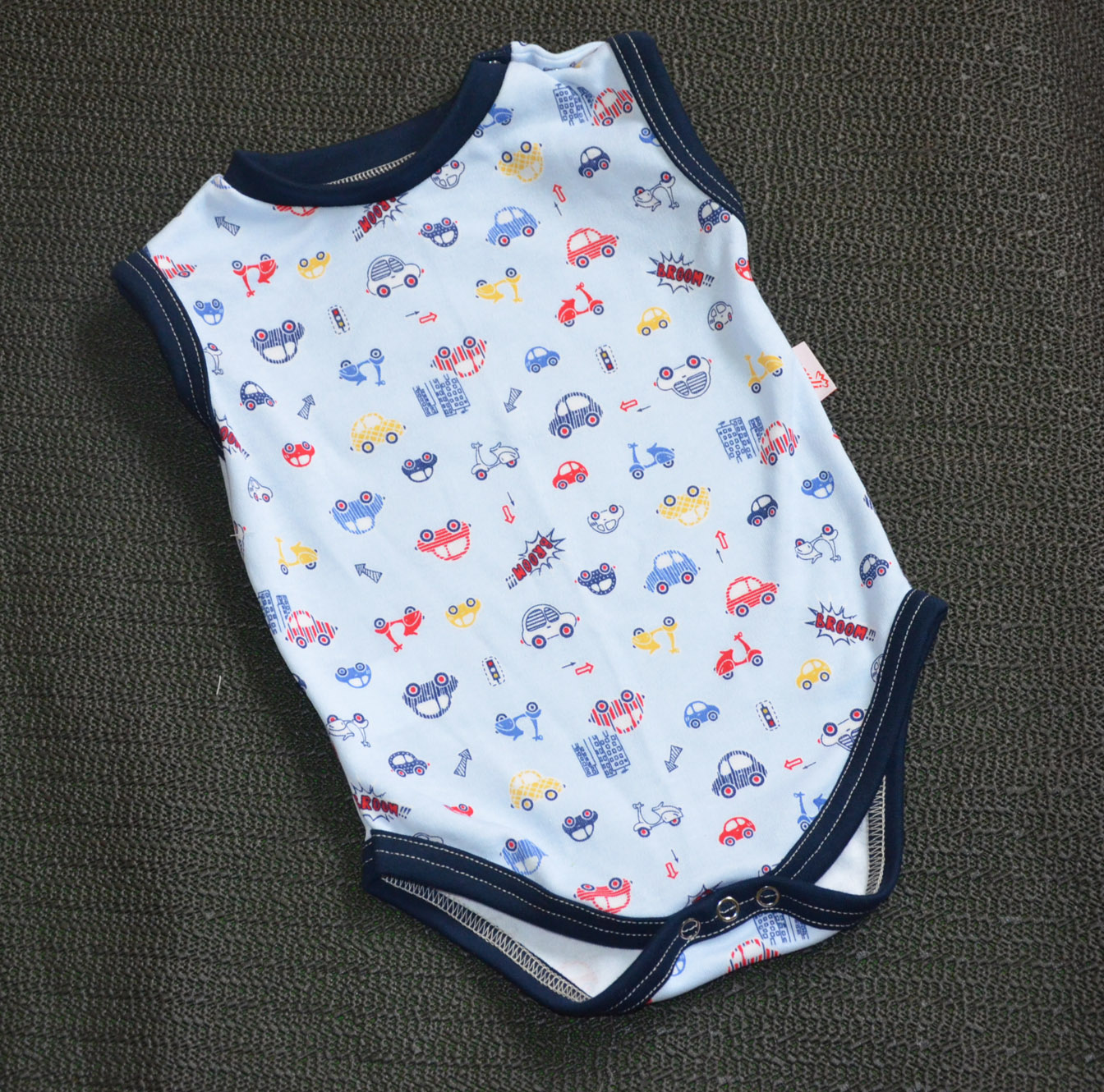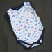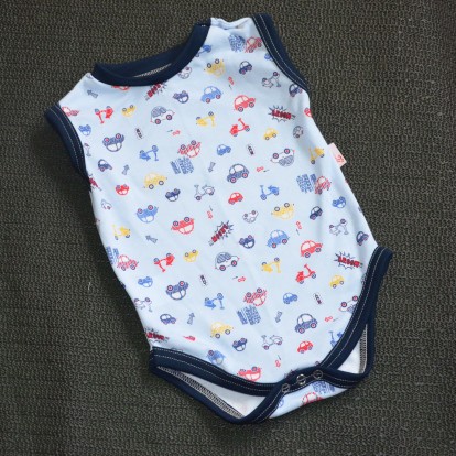 Příjemné bavlněné body-tílko bez rukávu, potisk drobných autíček, tm. modré lemy. U krku zapínání na dva baby druky, pohodlné oblékání a přitom žádný vytahaný výstřih. Mezi nožkama rovněž zapínání na baby druky.