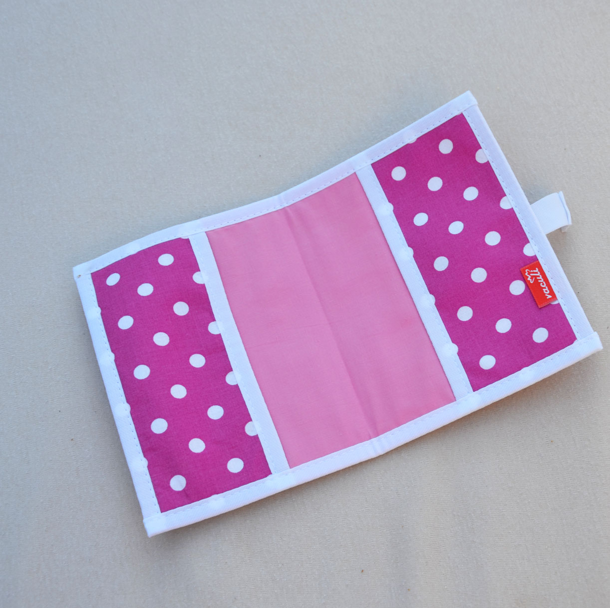 Obal na zdravotní průkaz s motivem puntíků na malinovém pozadí, bílá lemovka.