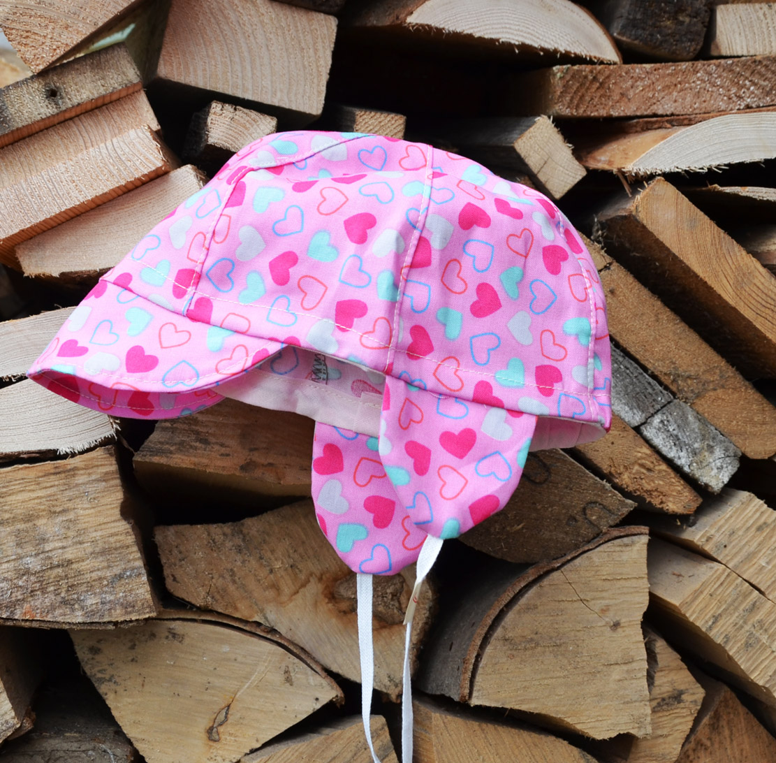 Kšiltovka pro miminka a malé děti, ušita z bavlněného plátna s potiskem srdíček na růžové. Vhodná do teplejšího počasí jako ochrana proti sluníčku. Ohybatelný kšilt, vzadu všita gumička pro lepší stabilitu, dostupná ve více velikostech (obvodech hlavy).