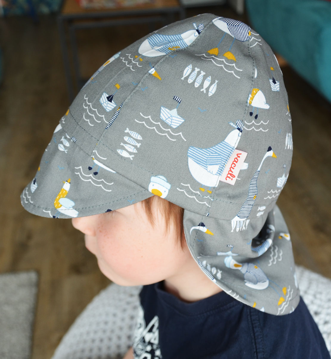 Kšiltovka s plentou pro miminka a malé děti, ušita z bavlněného plátna, motiv Kachna námořník na sv. šedém pozadí.
