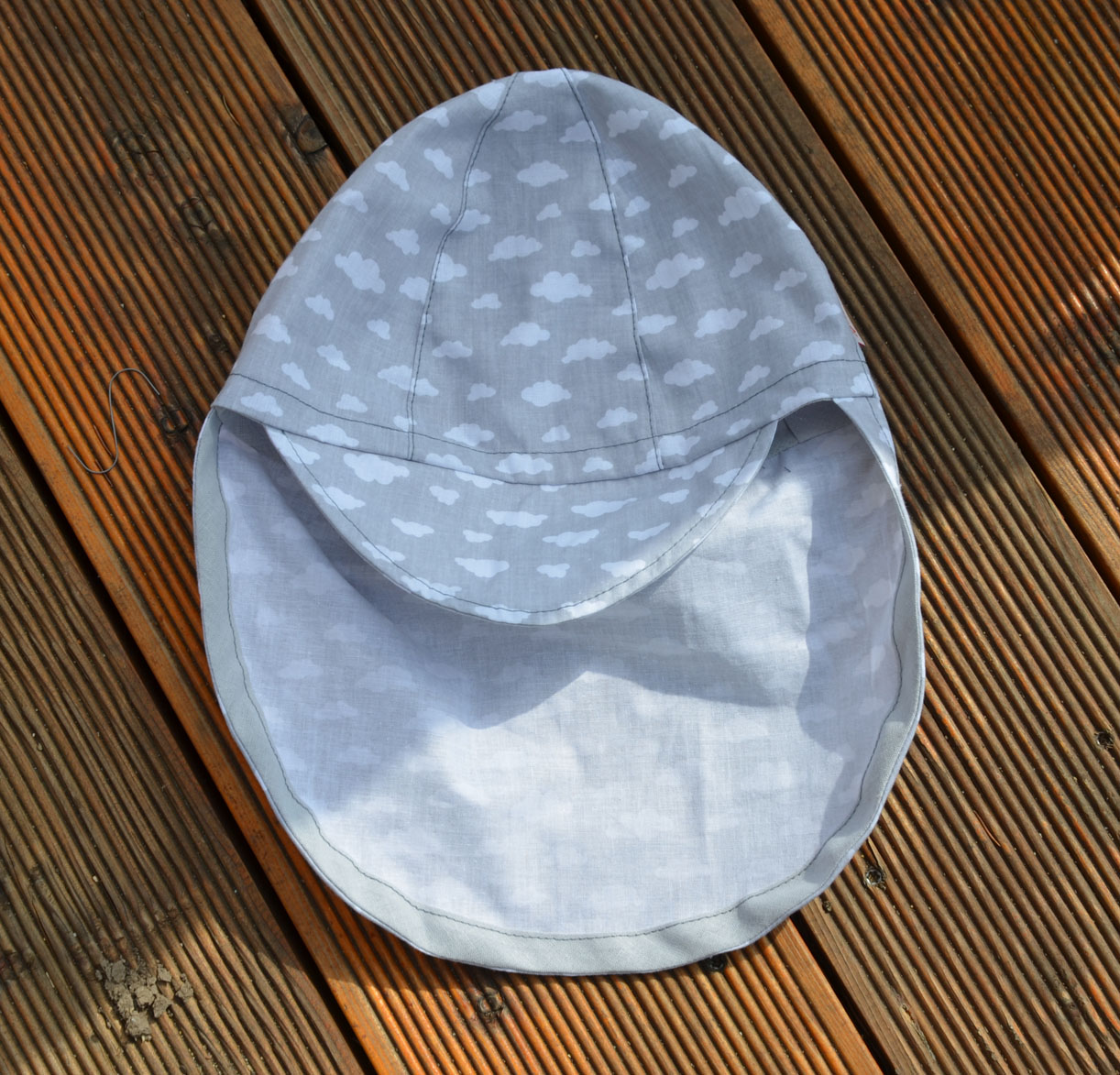 Kšiltovka s plentou pro miminka a malé děti, ušita z bavlněného plátna, motiv mráčků na šedém pozadí, unisex využití.