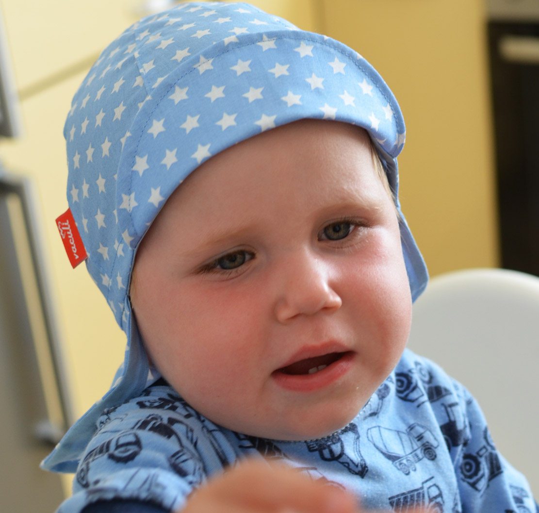 Vhodná do teplejšího počasí jako ochrana proti sluníčku, plenta chrání zátylek dítěte proti spálení. Vzadu všita gumička pro lepší stabilitu.