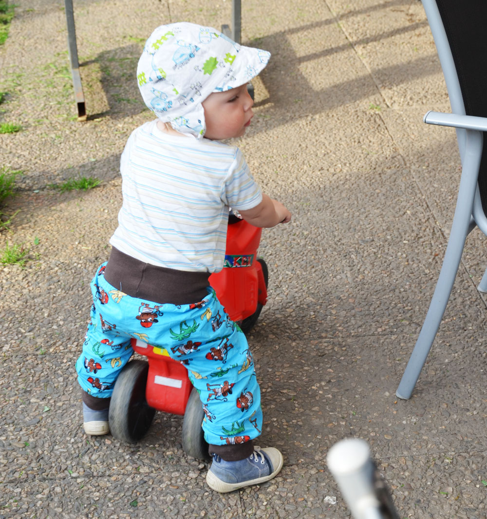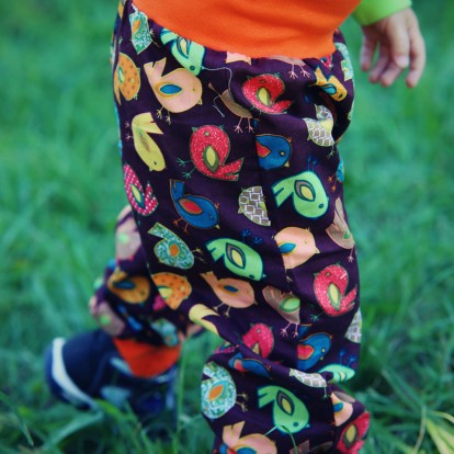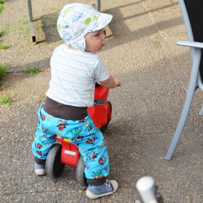 Pohodlné plátěné kalhoty, které lze využít jako rostoucí, tj. koupit o konfekční velikost větší a postupně dorůst. Pas zakončen do dvojitého lemu, od vel. 98 šijeme s nižším lemem a již navlečenou gumou, kterou si můžete dle potřeby upravit. Bavlněné plátno (nepruží) gramáž 140g/m2.
