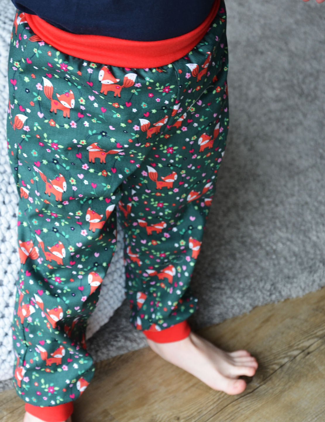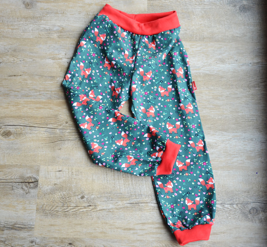 Dezén: Lišky na zelené, červené lemy v pase a u kotníků.