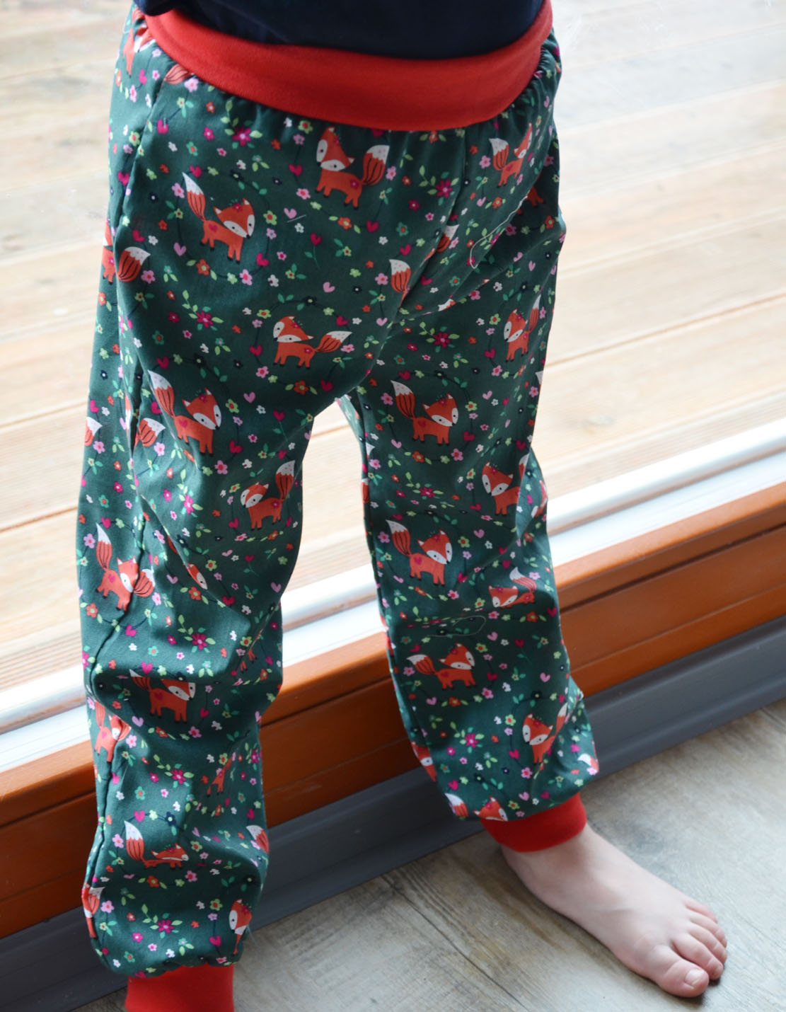 Kalhoty lze využít jako rostoucí, tj. koupit o konfekční velikost větší a postupně dorůst. Pas zakončen do dvojitého lemu, od vel. 98 šijeme s nižším lemem a již navlečenou gumou, kterou si můžete dle potřeby upravit. Bavlněné plátno (nepruží) gramáž 140g/m2.