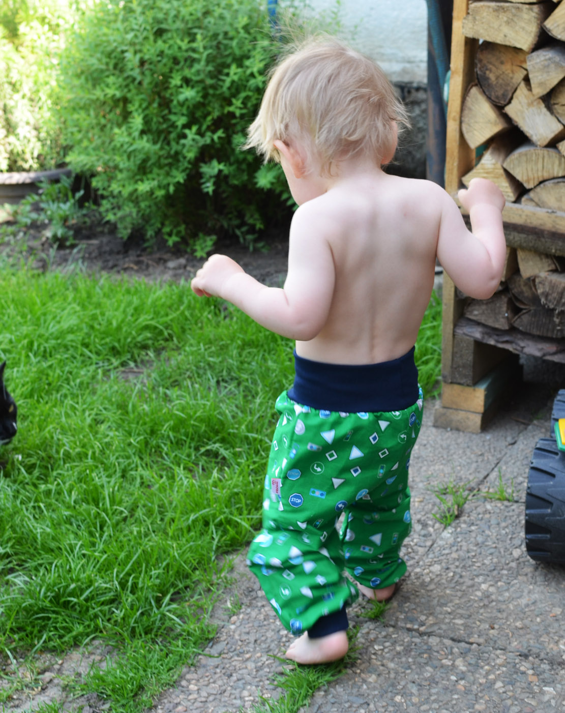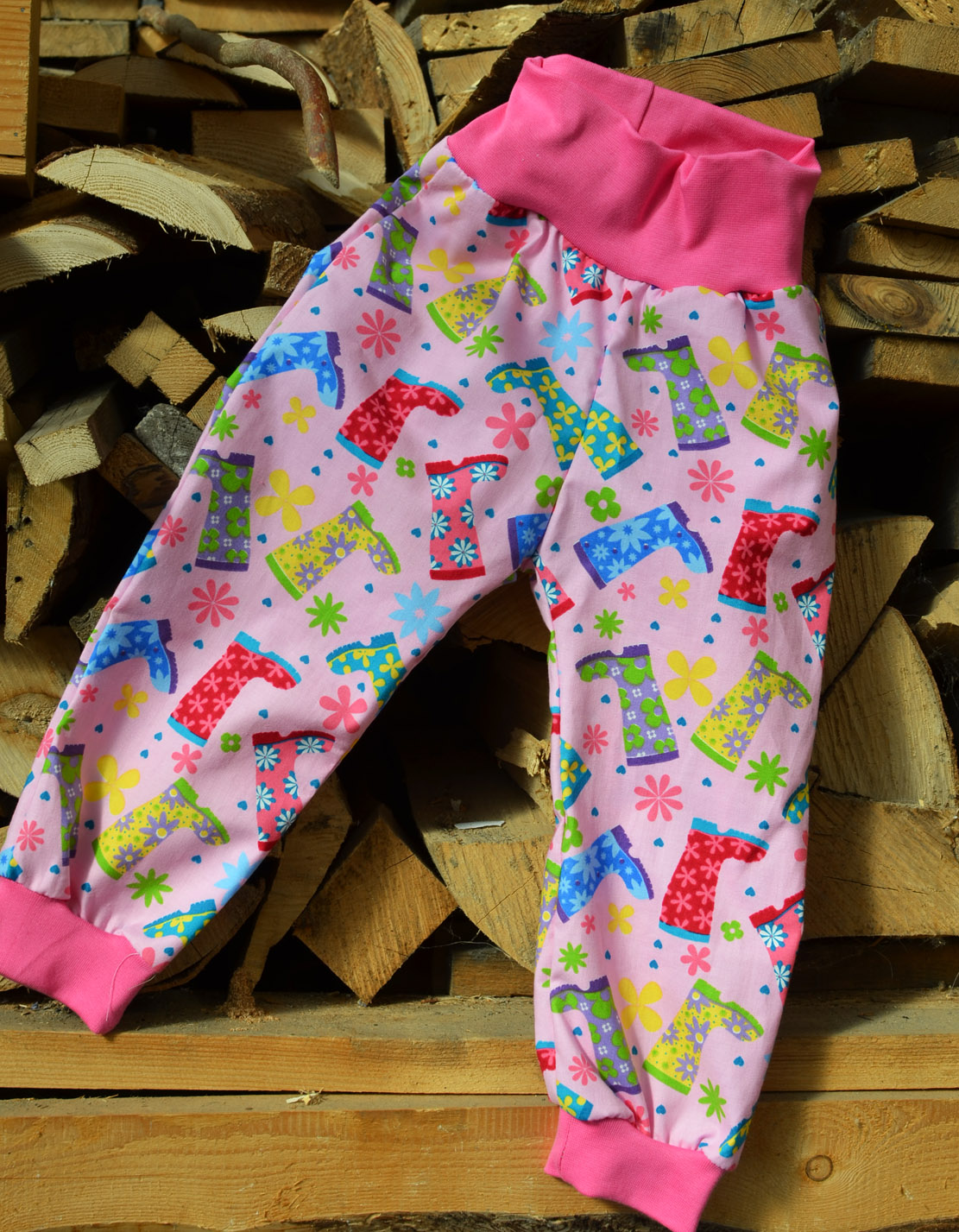 Pas zakončen do dvojitého lemu, od vel. 98 šijeme s nižším lemem a již navlečenou gumou, kterou si můžete dle potřeby upravit.