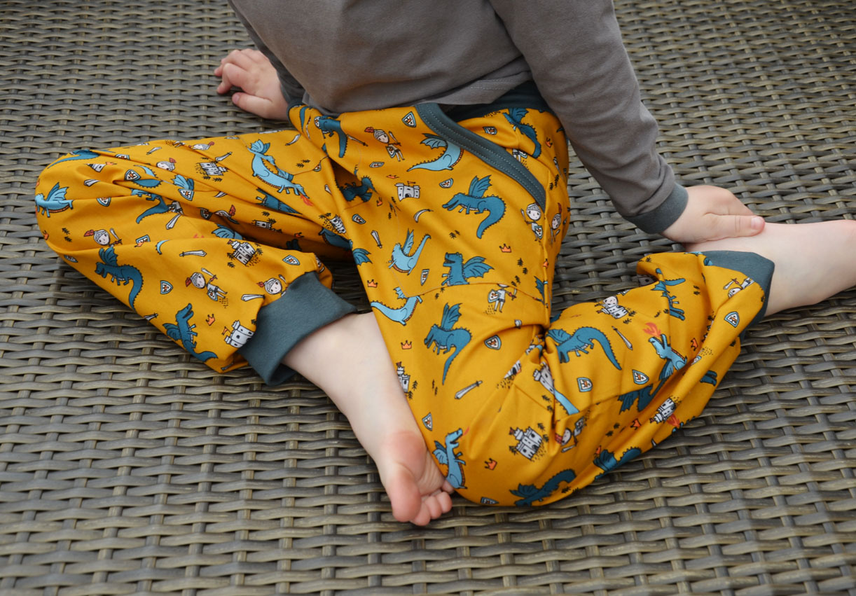 Nohavice ukončeny do lemu, který dítěti drží u kotníků.