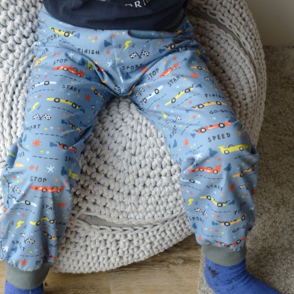Kalhoty lze využít jako rostoucí, tj. koupit o konfekční velikost větší a postupně dorůst. Pas zakončen do dvojitého lemu, od vel. 98 šijeme s nižším lemem a již navlečenou gumou, kterou si můžete dle potřeby upravit. Bavlněné plátno (nepruží) gramáž 140g/m2.