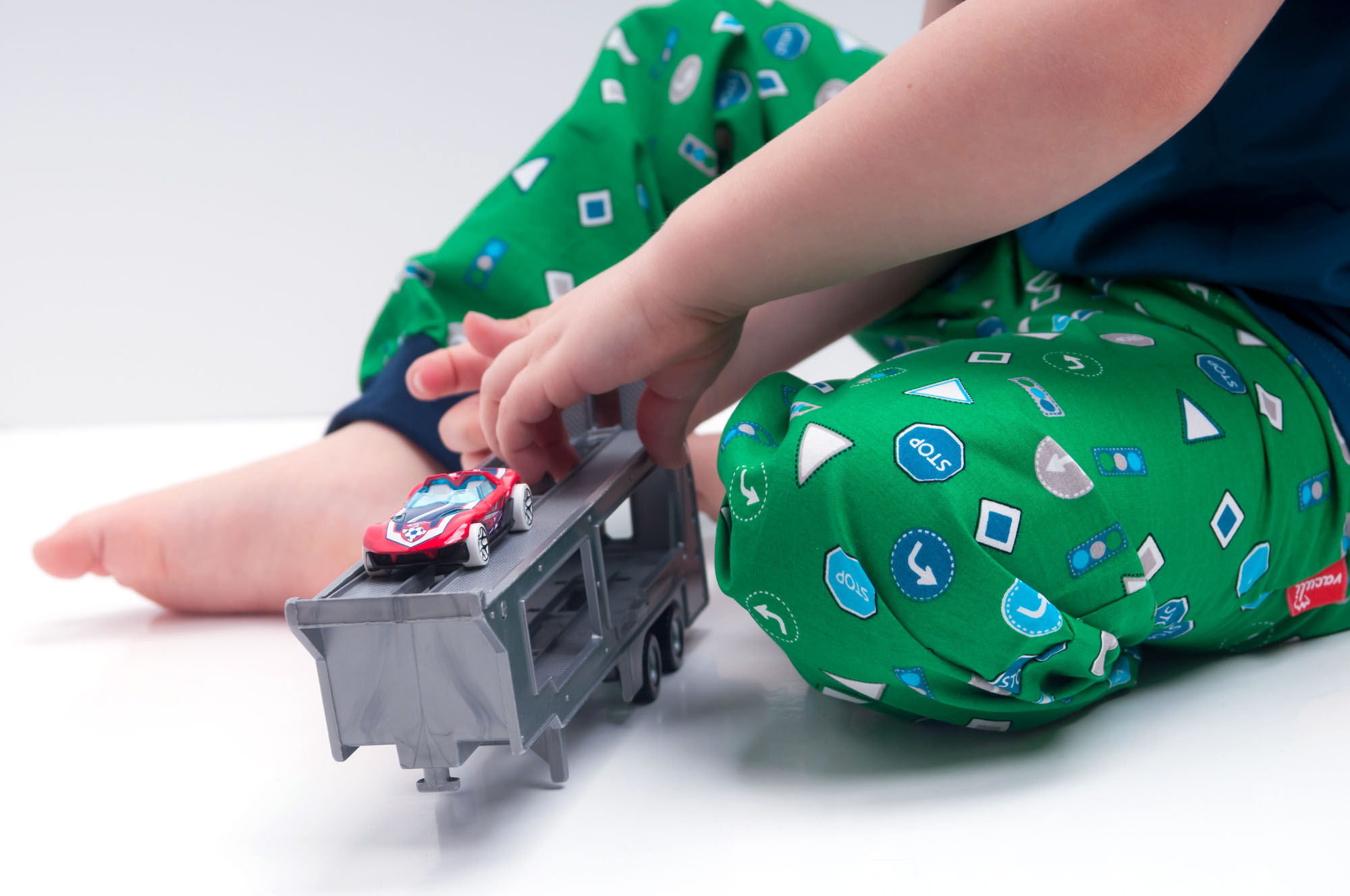 Pas zakončen do dvojitého lemu, od vel. 98 šijeme s nižším lemem a již navlečenou gumou, kterou si můžete dle potřeby upravit.