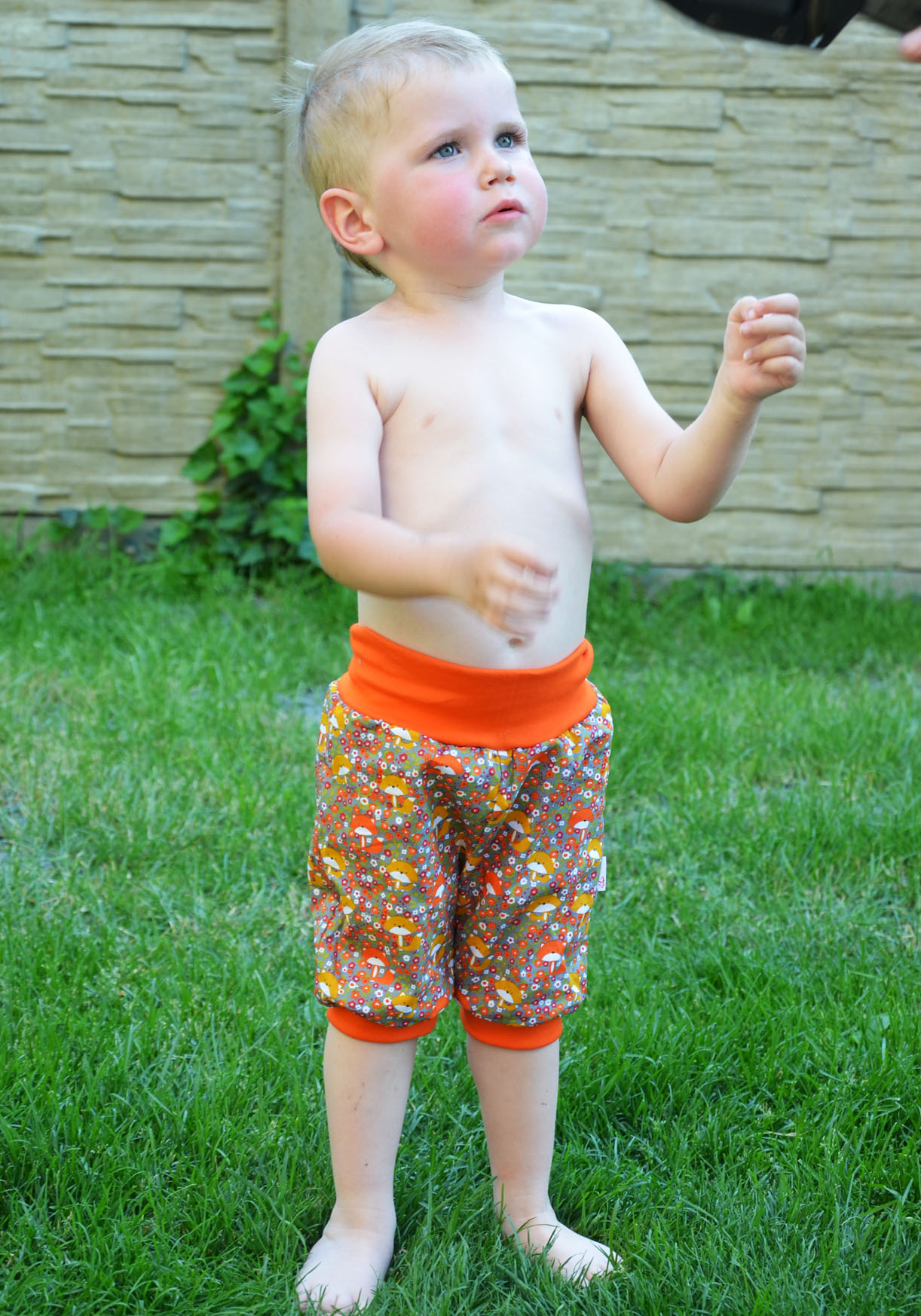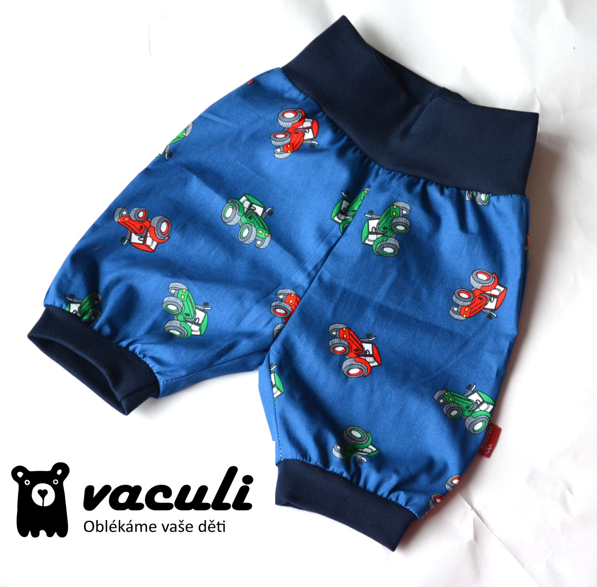 Vel. 98 a vyšší mají nižší lem s již navlečenou gumou. Kraťásky jsou z bavlněného plátna, volnějšího střihu, nicméně látka nepruží.