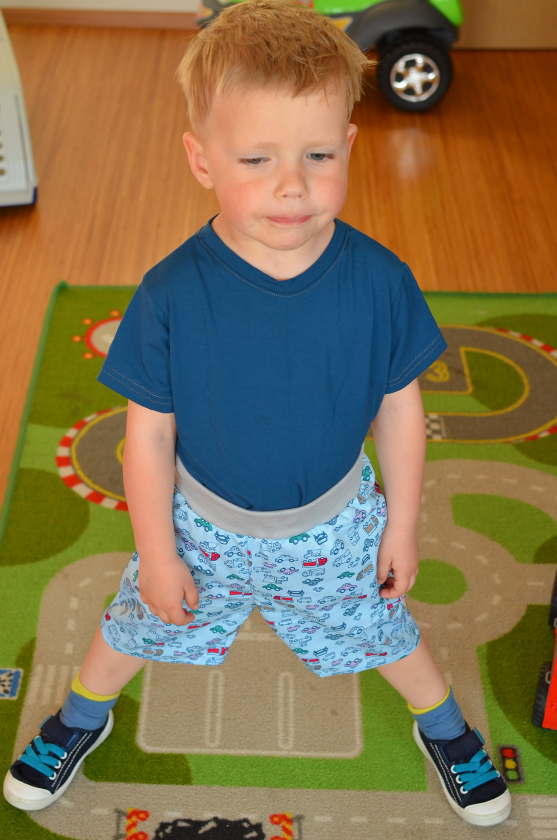 Pohodlné plátěné kraťásky Mini Auta na modré v kombinaci s šedým lemem. Dvojitý lem kolem pasu, který je pro malé děti většinou dostačující. Pro všechny případy je v samotném lemu předpřipravený otvůrek na gumu. Vel. 98 a vyšší mají nižší lem s již navlečenou gumou. Kraťásky jsou z bavlněného plátna, volnějšího střihu, nicméně látka nepruží.