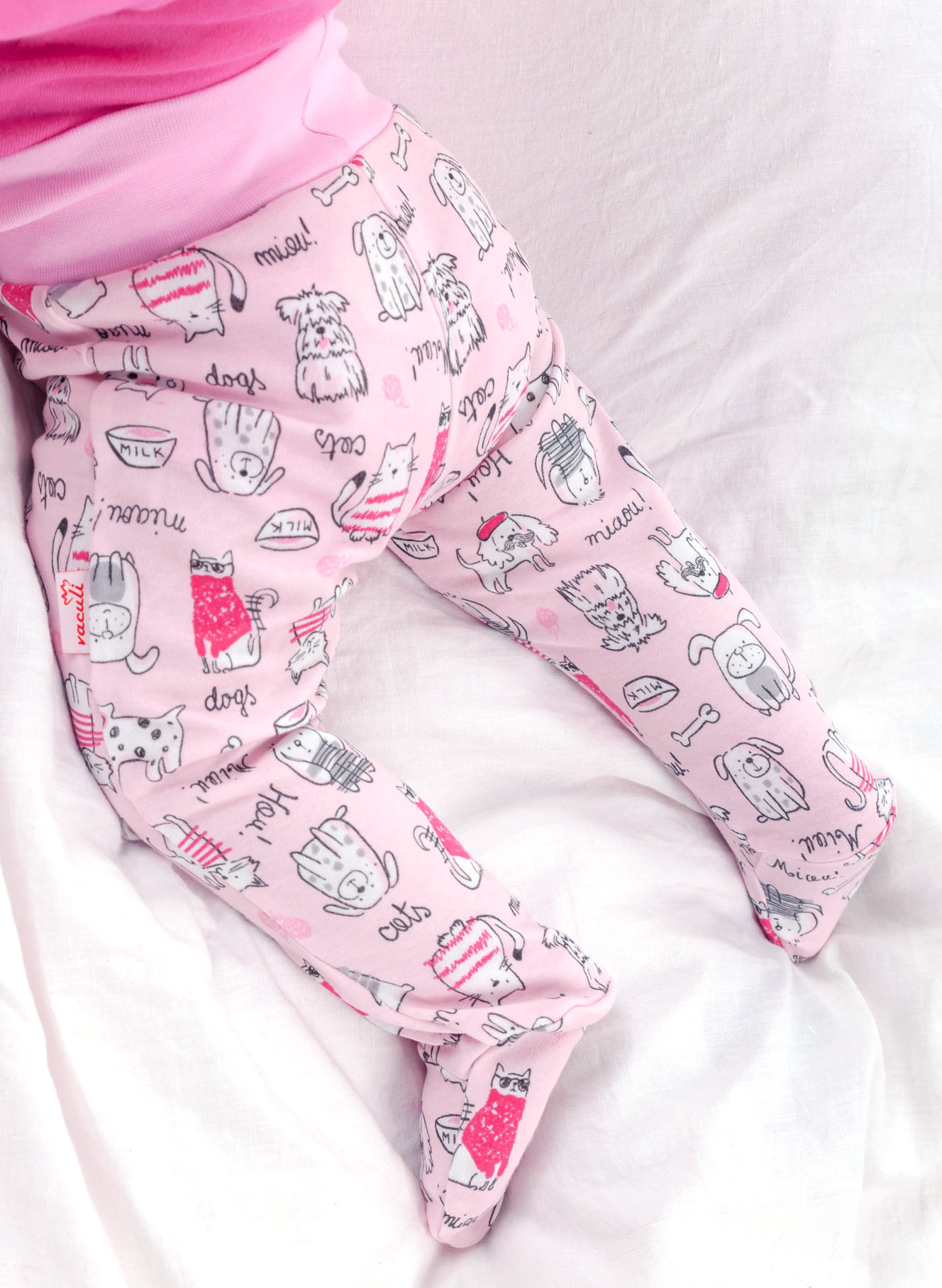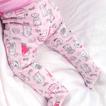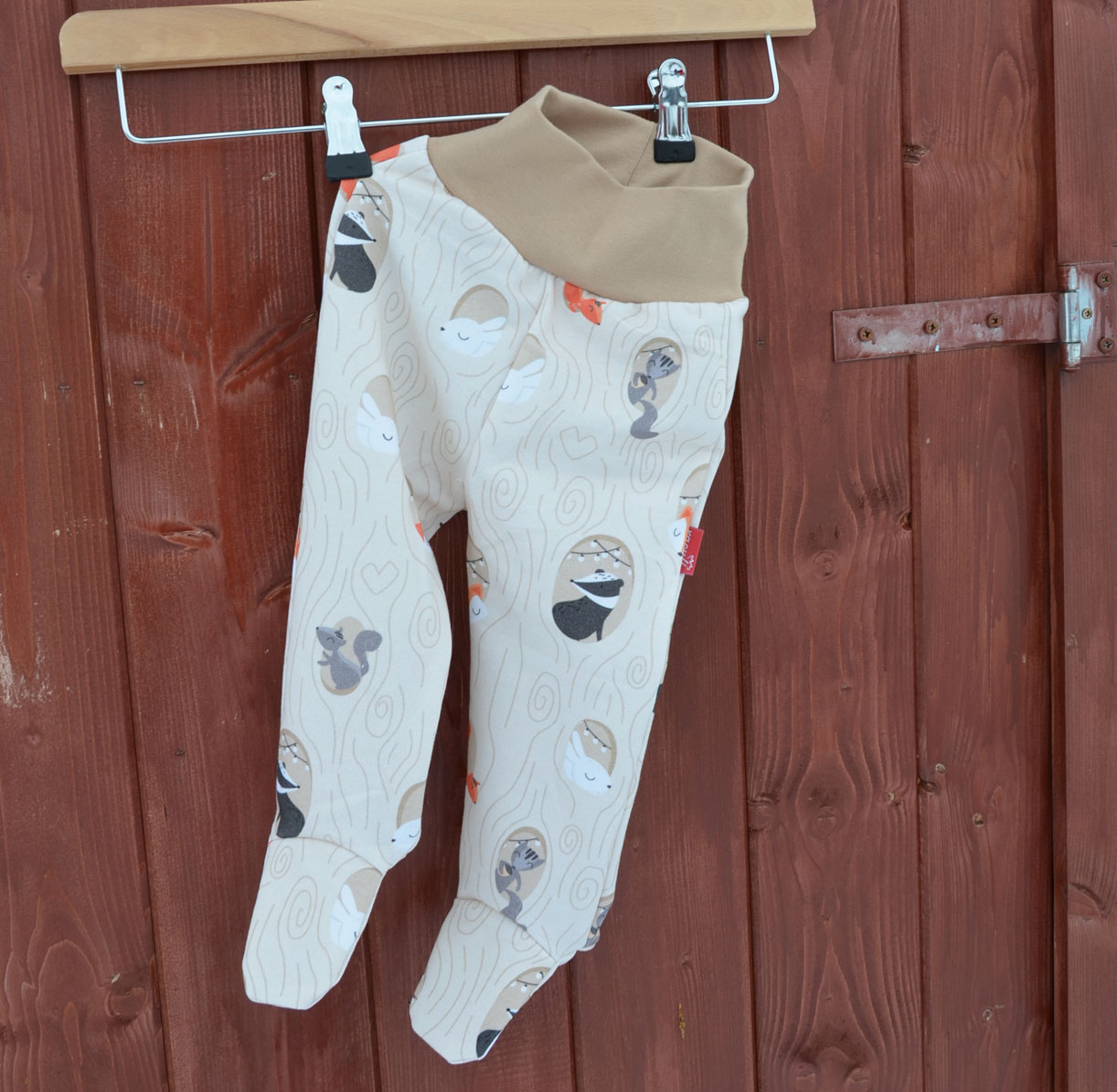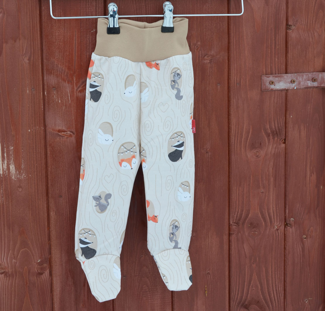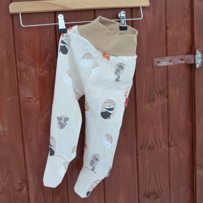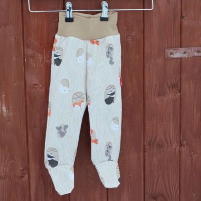 Pohodlné dětské polodupačky unisex v dezénu Spící zvířátka na béžovém pozadí v kombinaci s temně béžovým lemem v pase.