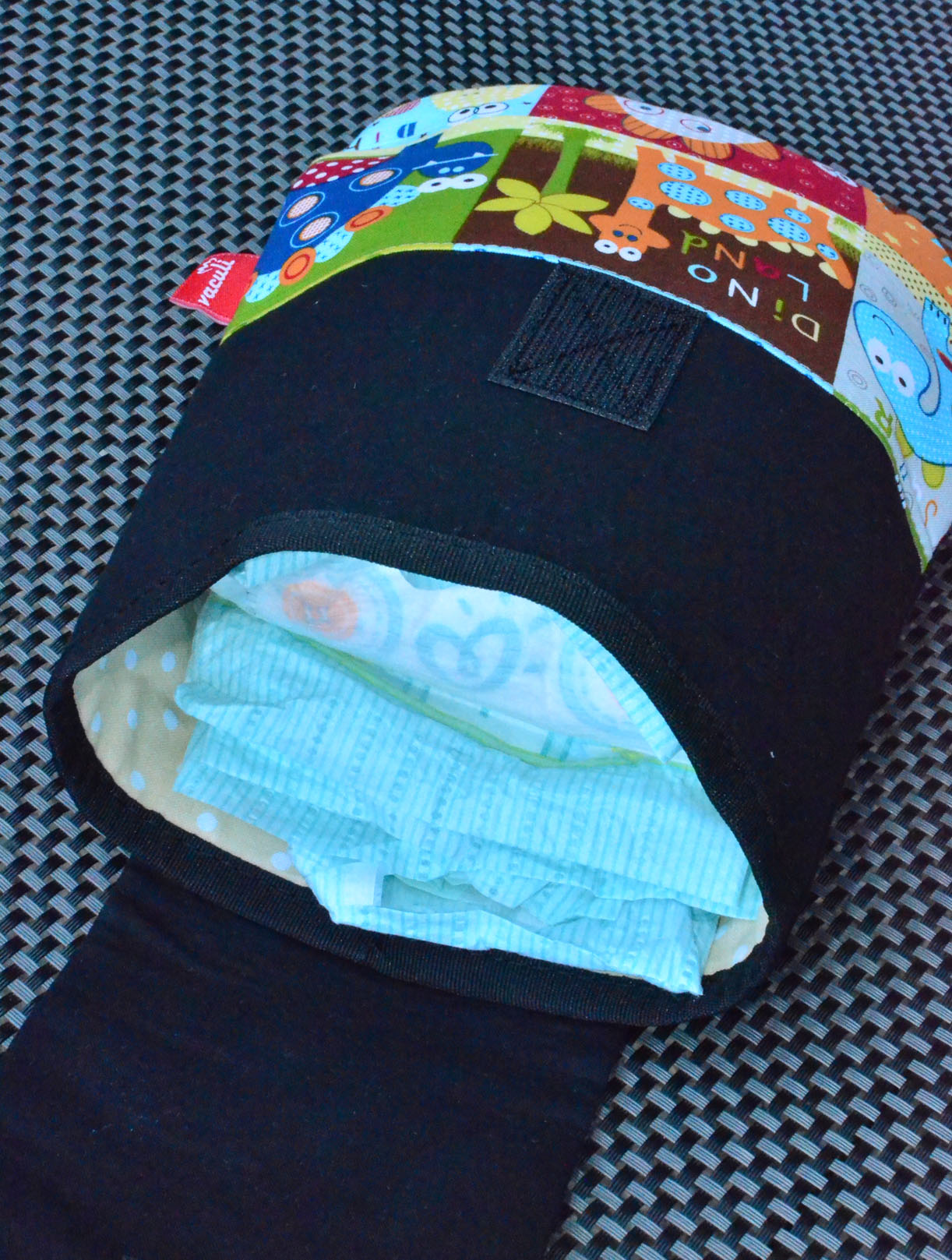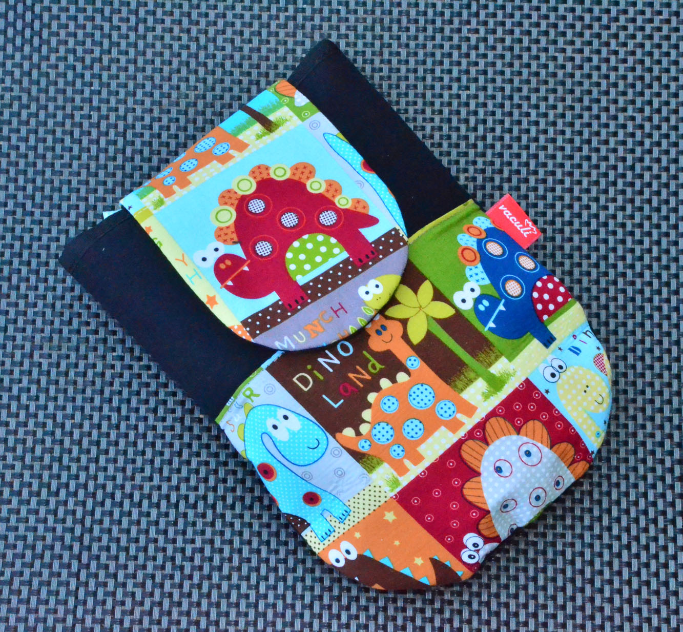 Plenkovník s obrázkem, který při přebalování zabaví dítě a přitom elegantní. Zadní strana jednobarevná černá. Bavlněná podšívka, černé lemy, všechny švy skryty. Rozměry 19x25 cm. Potisk dinosaurů se může lišit dle střihu předního dílu. Vlastní design. Zapínání na dostatečně velký a kvalitní suchý zip, přizpůsobí se počtu plenek v taštičce.