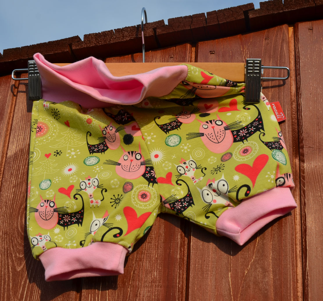 Kraťásky jsou z úpletu, volnějšího střihu a pružné s vyšším sedem, dostatečně pojmou plenku. Jeden rok mohou sloužit jako kraťásky pod kolena s plenkou, druhý rok jako kraťásky do půli stehen (třeba již bez plenky:)...