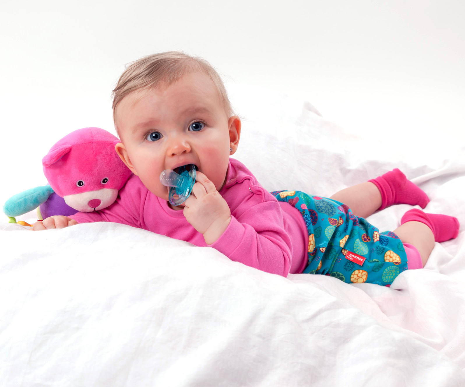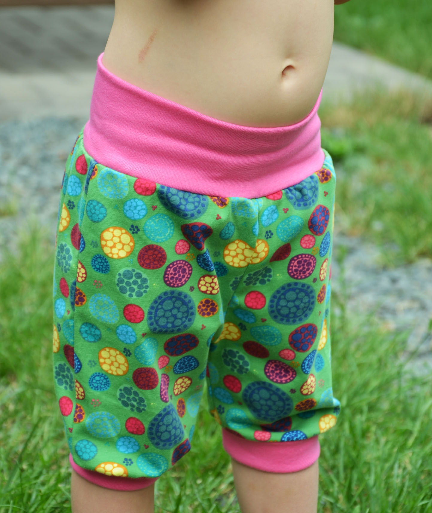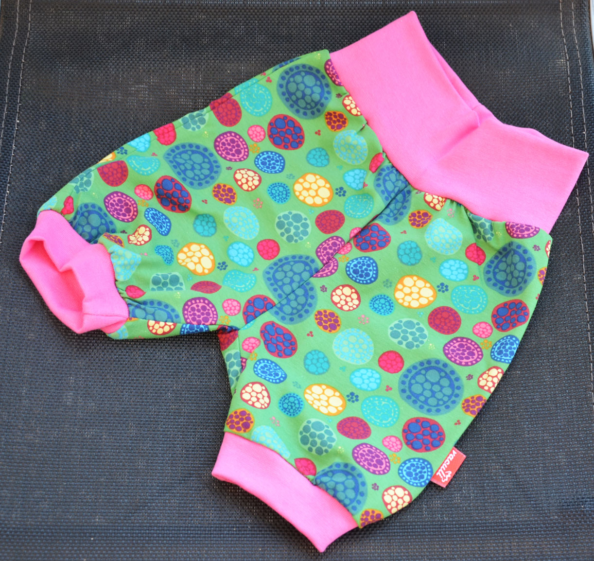 Pohodlné dívčí kraťásky s motivem barevných kol na zeleném podkladu, malinové lemy.