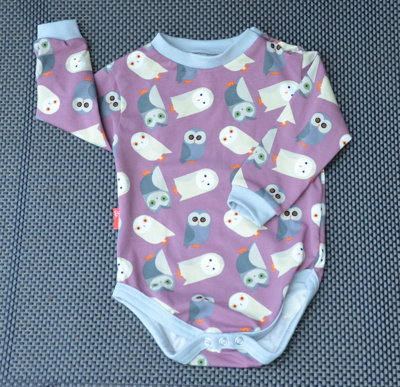 Pohodlné kojenecké body z vysokogramážního úpletu s podílem elastanu. Pružný a pevný materiál. Potisk sov na fialovo-šedé, šedé lemy. Lemy kolem zápěstí pěkně drží rukávy a body roste s dítětem. U krku zapínání na baby druky, žádný vytahaný výstřih. Mezi nožkama rovněž zapínání na baby druky.