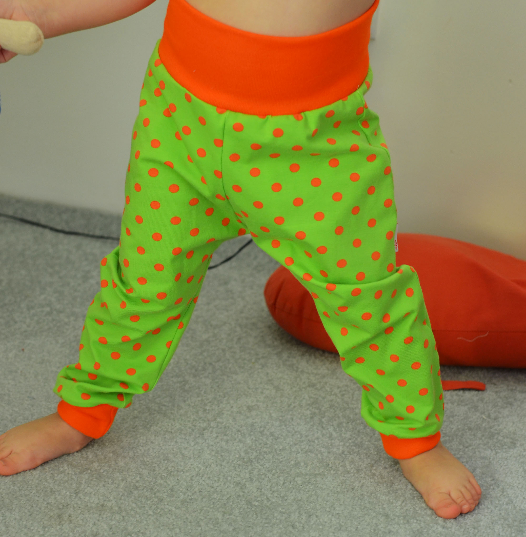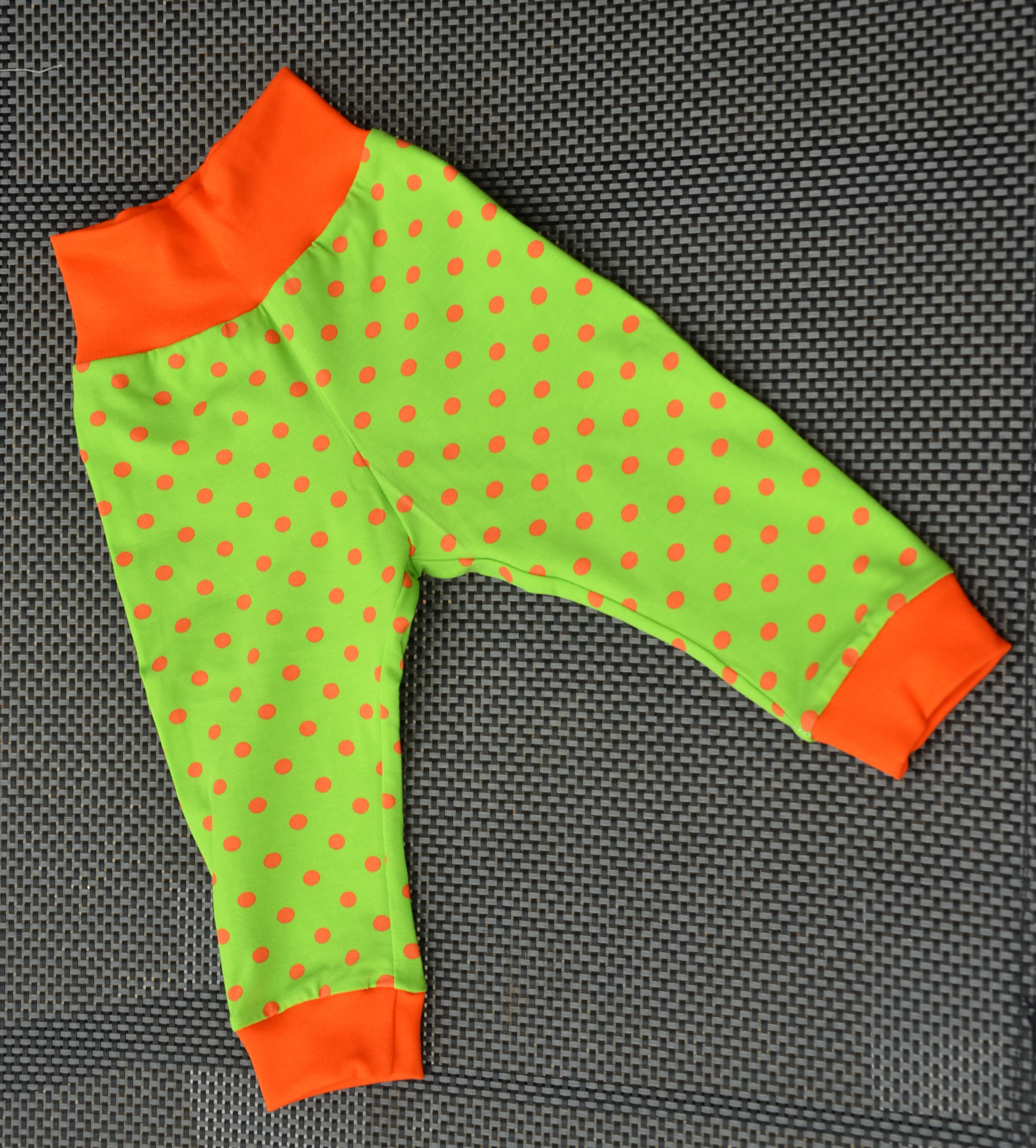 Vysokogramážní úpletové tepláčky v potisku oranžových puntíků na zelené, oranžové lemy. Díky lemům u kotníku je možné zakoupit kalhoty o velikost větší a využít jako rostoucí. Vyšší pružný lem v pase, který se dítěti přizpůsobí a nikde netlačí. V lemu navíc připravena i dírka na gumu. Od vel. 98 šijeme tepláčky s nižším lemem s již navlečenou gumou, která je přístupná. Materiál: bavlna s 5% elastanem (úplet), gramáž 220g/m2