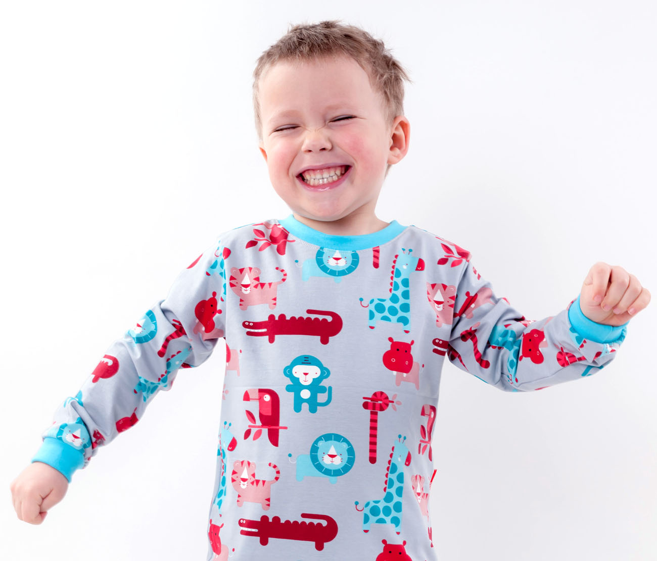 Potisk zvířátek ze zoo na šedém podkladu, tyrkys lemy.