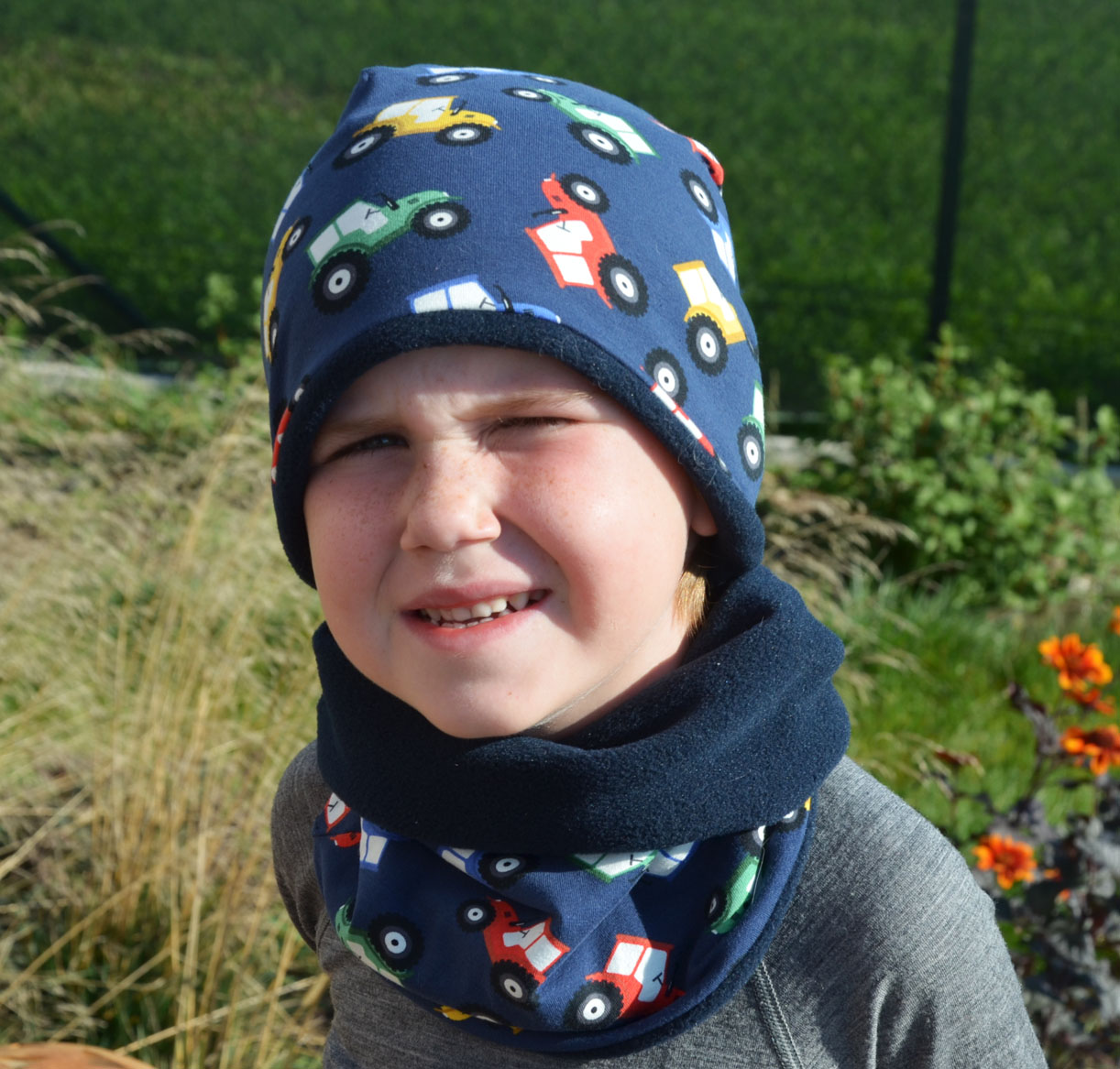 Designová zateplená čepička Rovného střihu v potisku Traktory na tm. modré v kombinaci s tm. modrým fleecem. Poroste s vaším dítětem. Vhodná do chladného podzimu/zimy.