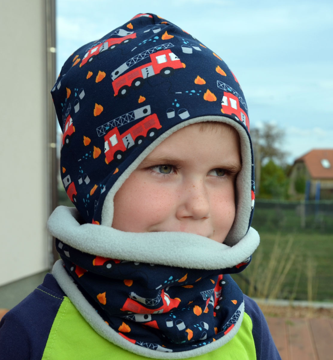 Designová zateplená čepička střihu Ušanka v potisku Hasiči na temně modré v kombinaci se sv. šedým fleecem. Poroste s vaším dítětem. Vhodná do chladného podzimu/zimy. Materiál: Bavlněný úplet silněší gramáže (220 g/m2) s podílem elastanu, v kombinaci s fleecem (100% MicroPes), NOVĚ 4 dostupné velikosti, vel. 1 a 2 mají šňůrky na zavazování.
